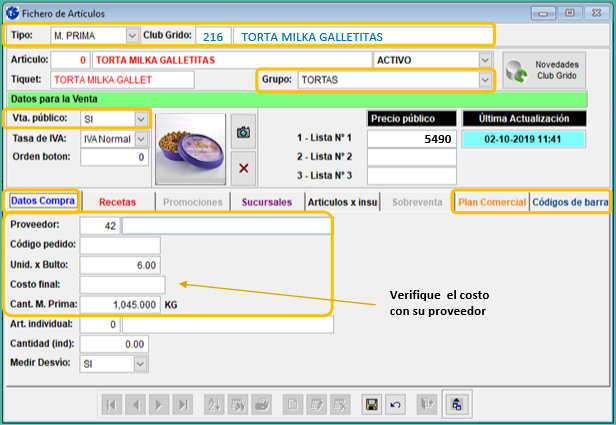 La información debe verse del siguiente modo en su Fichero de Artículos: